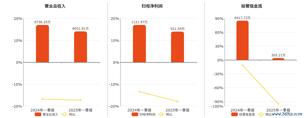 公司营业总收入为8051.91万元,较去年同报告期营业总收入减少1684.33万元,同比较去年同期下降17.30%。归母净利润为921.54万元,较去年同报告期归母净利润减少200.43万元,同比较去年同期下降17.86%。经营活动现金净流入为305.21万元,较去年同报告期经营活动现金净流入减少6112.52万元,同比较去年同期下降95.24%。