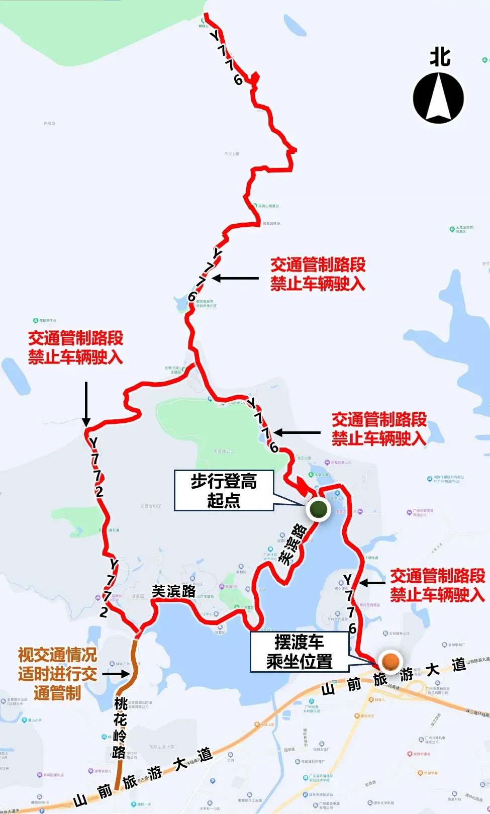 (二)登高群众请在芙蓉度假区大门(东门)集中乘坐摆渡车进入,在芙滨路与乡道Y776交界处(芙蓉居委路口)开始步行登山。乡道Y772芙蓉度假区西入口位置以及乡道Y776梯面镇往芙蓉度假区方向严禁机动车驶入芙蓉度假区;