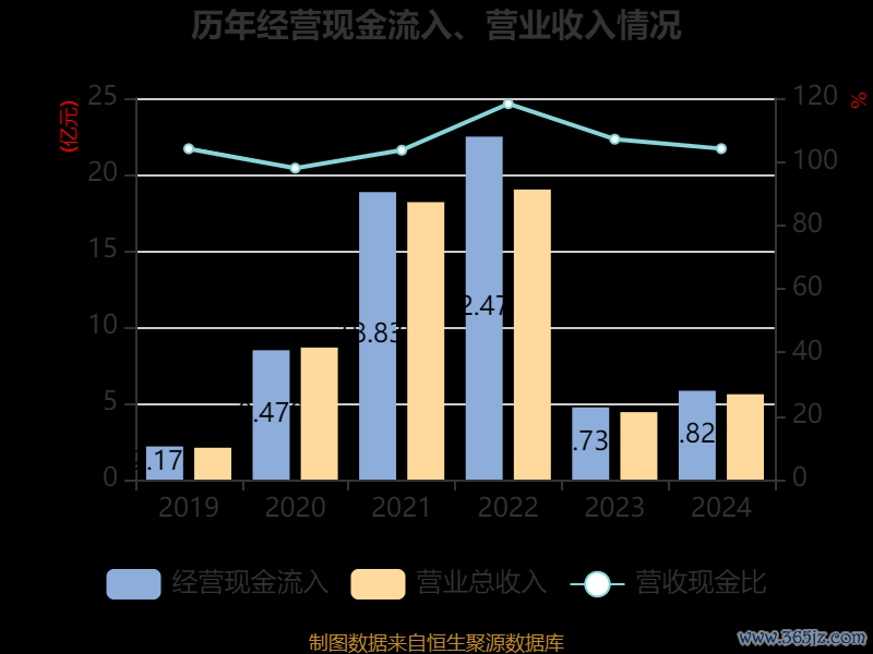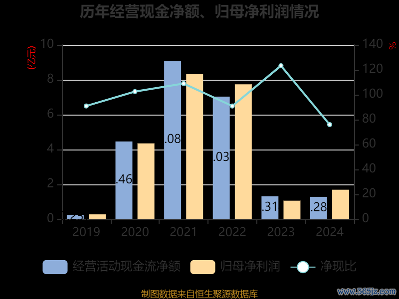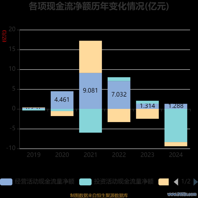 截至2024年,公司经营活动现金流净额为1.29亿元,同比下降1.94%;筹资活动现金流净额-1.05亿元,同比增加1.45亿元;投资活动现金流净额-8.38亿元,上年同期为7436.25万元。